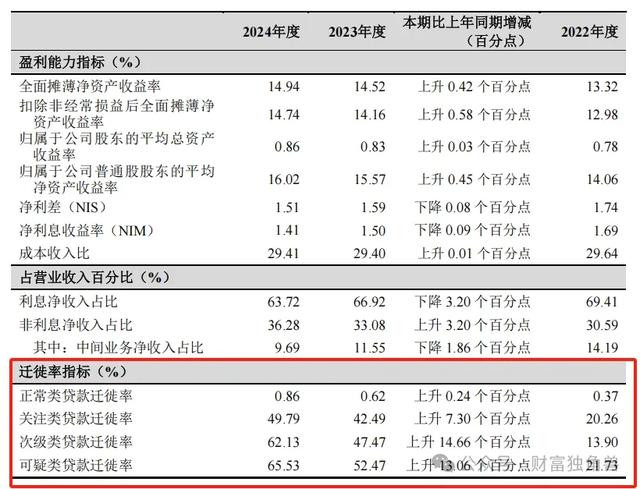 关注类贷款迁徙率在2024年显著上升,增加7.3个百分点,达到49.79%。正常类贷款向关注类迁徙比例上升,潜在风险敞口扩大。尤其是2024年,这一比例的上升,显示其信贷资产质量面临的指标波动。